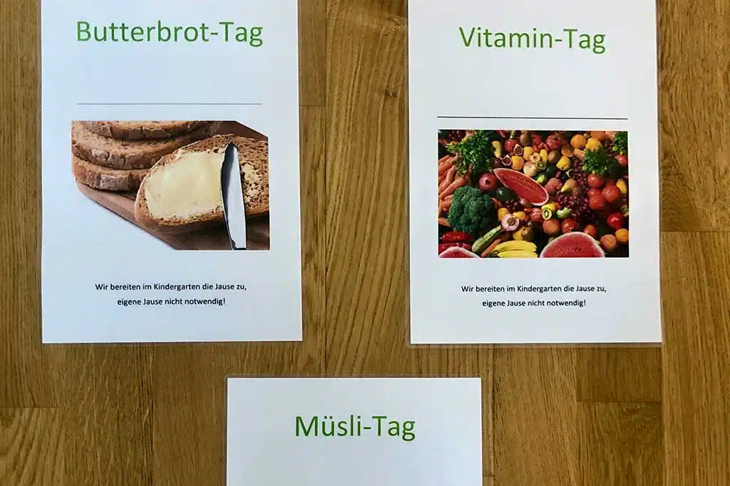 Im Kindergarten Herrnau findet seit letztem Jahr einmal in der Woche der gesunder Jausentag statt. Die im Haus vorbereitete Jause gibt es gruppenübergreifend in der Küche. Im Wechsel gibt es den Butterbrottag, den Vitamintag und den Müslitag!